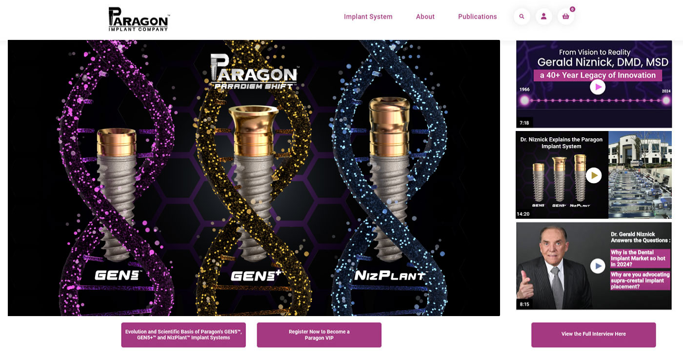 In this second edition of a series of newsletters I will provide a roadmap to Paragon’s™ very content-rich website that includes many videos, articles, product analysis and controversies. Regardless which implant system(s) you are currently using, the general information provided on Paragon’s™ website will broaden your knowledge and better help you make an informed decision regarding products and procedures. The centerpiece of the Paragon’s™ Home Page is a five-minute 3D graphic video explaining the features, benefits, and applications of the three implants that make up the Paragon™ Implant System. My innovations, including 33 US Patents, are the DNA of modern implants, and, along with 3 new innovations (Pat. Pend.), are incorporated in my new Generation 5 implant designs. To the right are links to three other videos, including a 7-minute chronology of my 60 year dental career. The other two are excerpts of an interview that includes a slide presentation of the Paragon™ System and answers to questions related to the implant industry in general, and sub-crestal placement of implants in particular. Once Paragon™ receives its FDA Clearance, a shopping cart will be added to the website.